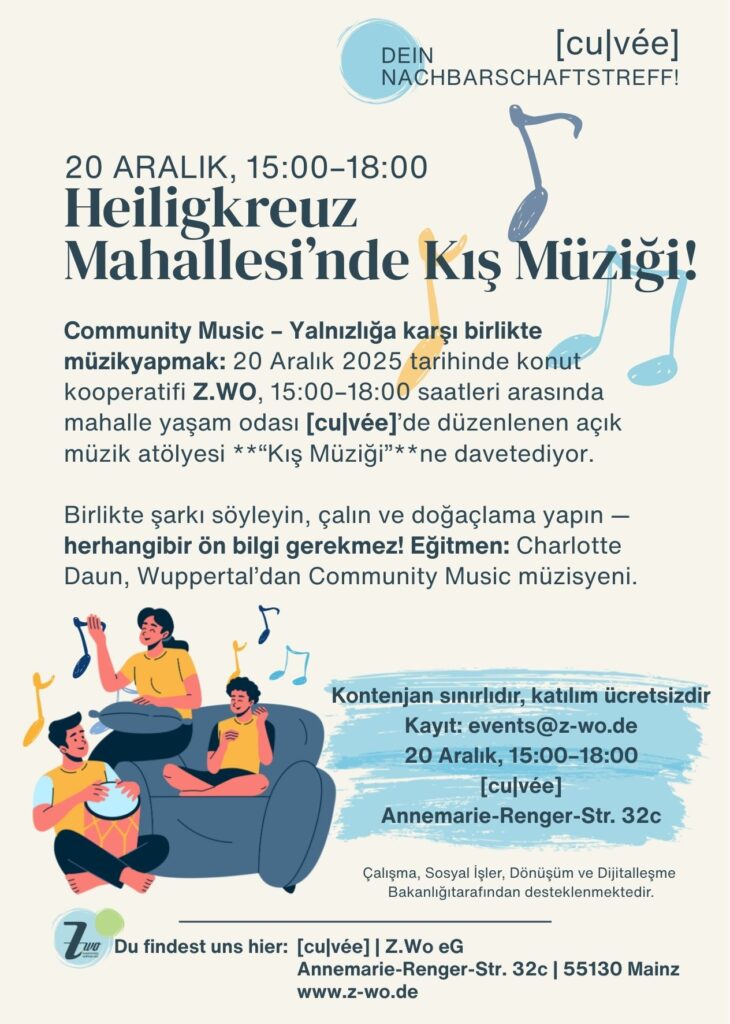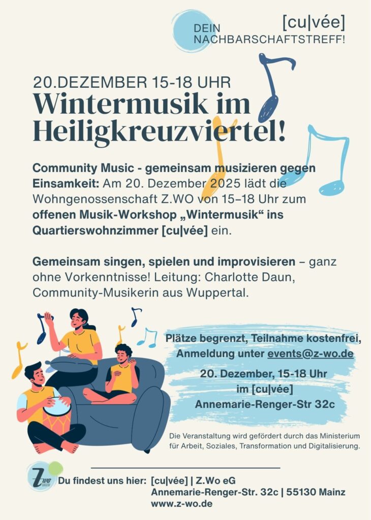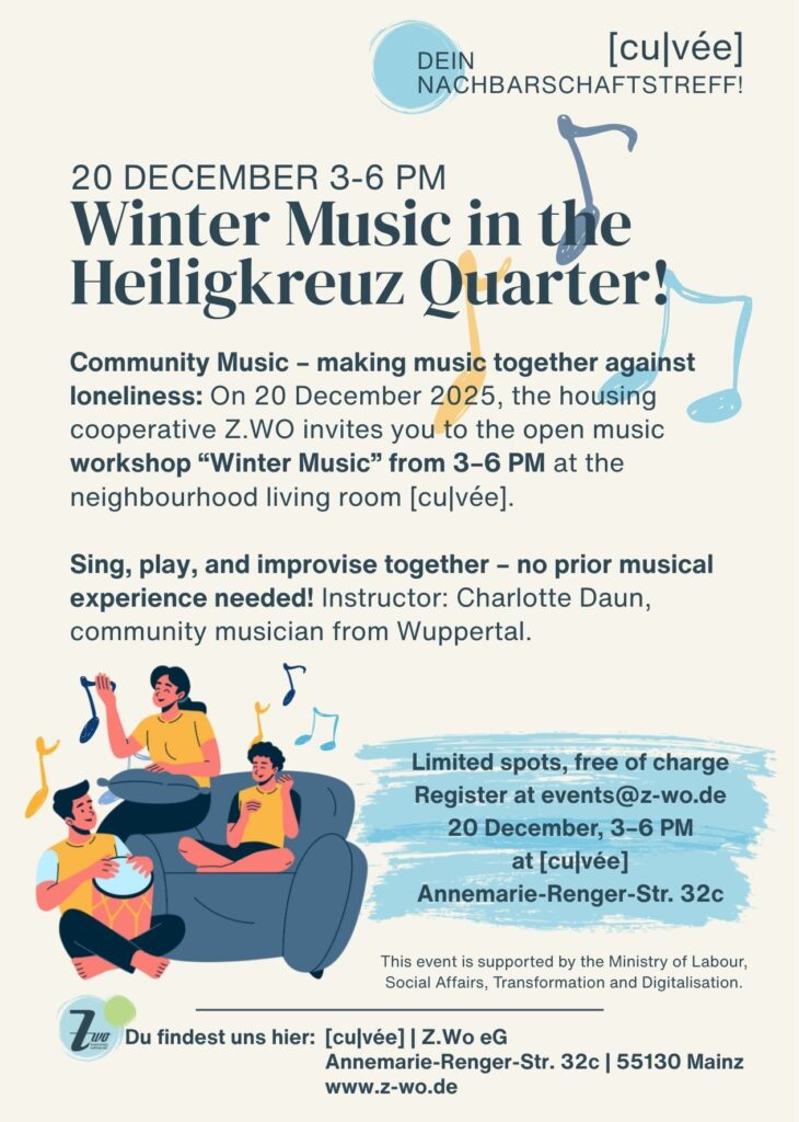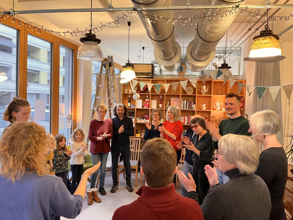 Nachdem wir ein weiteres Lied gelernt hatten, gab es als Highlight die Aufgabe, zusammen ein eigenes Lied zu texten, zu komponieren und zu interpretieren. Aus einer Wortsammlung – Thema: Unser Viertel – entstanden zwei sich reimende Zweizeiler mit einer einzelnen, besonderen Zusatz-Zeile. Eine Melodie hatten wir auch bald gefunden. Nachdem jede und jeder ein Instrument genommen und das Saxophon ein Intro gespielt hatte, ging es los. Über Harfen-, Gitarren- und Glockenklängen schwang sich die Querflöte auf und alle sangen hochkonzentriert und mit Schalk im Nacken: