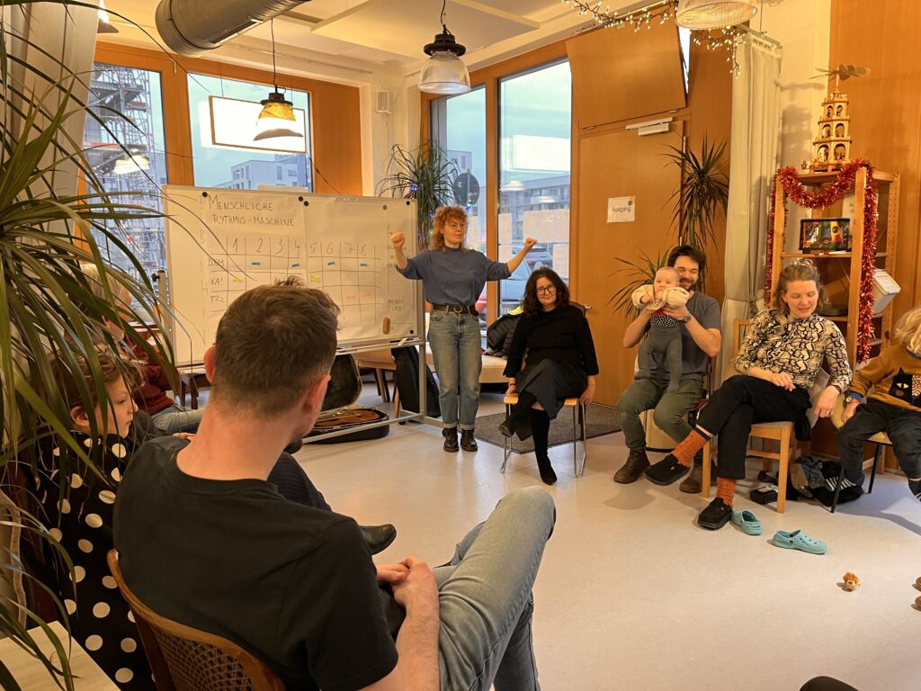 Dann wurde es rhythmisch: Über einen gestampften Grundrhythmus hinweg klatschte jede und jeder nacheinander im Kreis eine Folge vor und die anderen wiederholten diese gemeinsam. Und schon hatten wir unseren Groove!