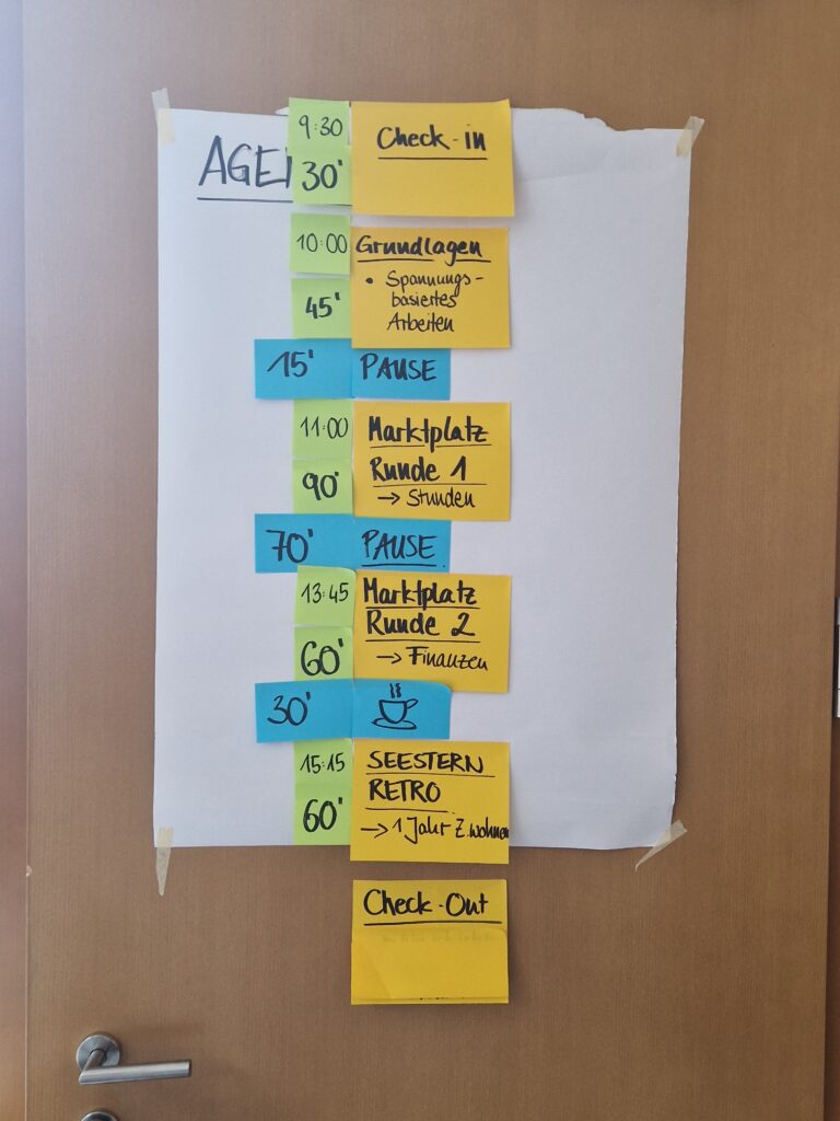 Als eine Herausforderung hatte sich in der ersten Wohnphase herausgestellt, dass wichtige Informationen auf den von uns genutzten Kanälen nicht regelmäßig für alle weitergegeben werden, manchmal verloren gehen oder nicht als wichGg erkannt werden. So entstand in der Gruppe einerseits der Wunsch nach mehr Information und andererseits auch der Wunsch Informationen teilen zu wollen. Wie wir in diesem Workshop gelernt haben, sind das „Spannungen“, die die Grundlage für das spannungsbasierte Arbeiten darstellen. Bei dieser Methode, mit der wir bei diesem Workshop im ersten Teil gearbeitet haben, gibt es vier Säulen: Personen teilen Informationen, Personen fordern Informationen ein, Personen fordern ein To Do ein (Wer erledigt welche Aufgabe bis wann?) und zu guter Letzt eine Rolle ggf. erweitern oder eine neue einrichten. Mit Hilfe dieser Methode konnten in der ersten Arbeitsphase alle Anwesenden auf den gleichen Informationsstand gebracht werden und ein paar neue To Dos identifiziert werden.
